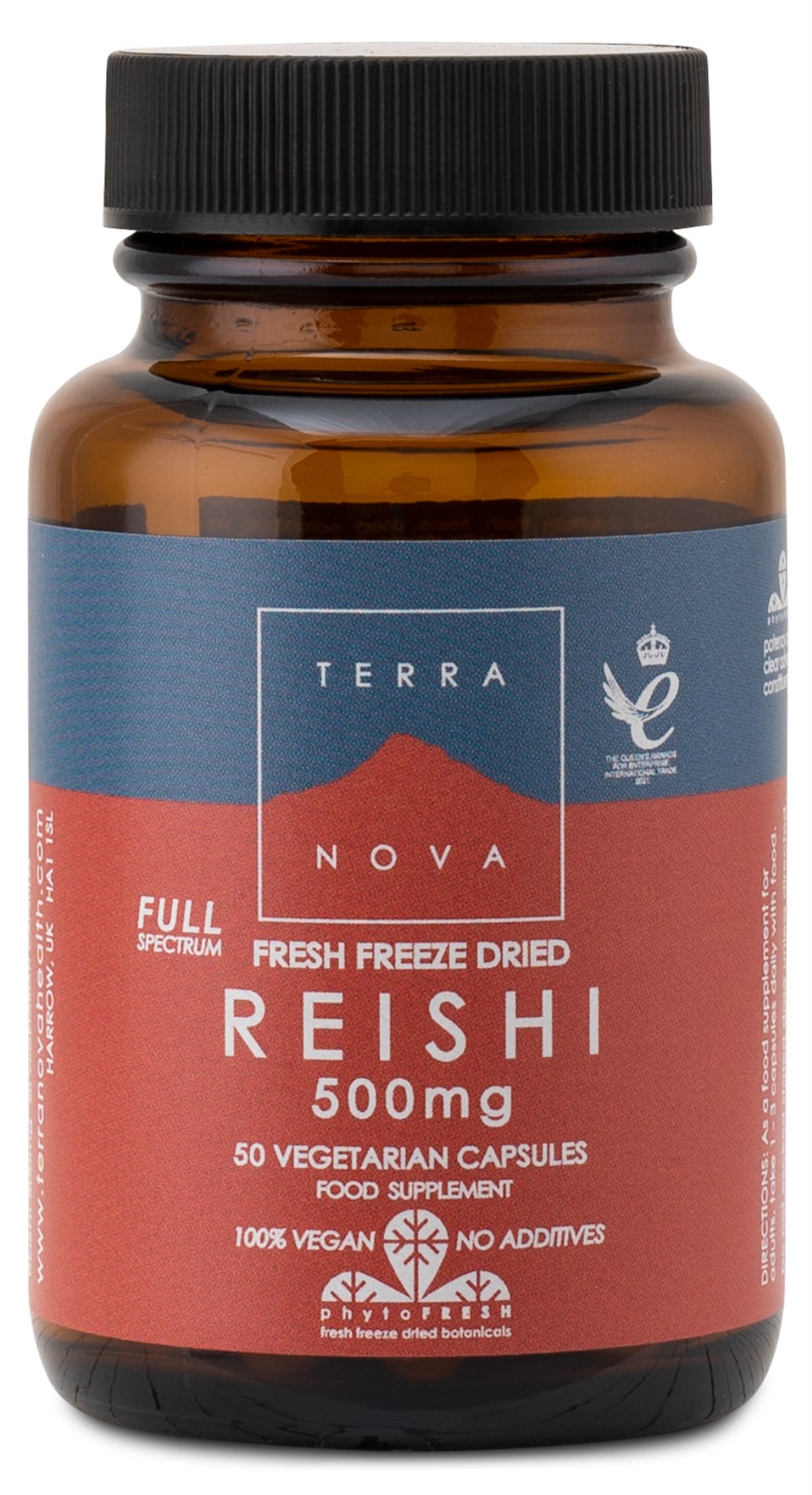 Terranova Reishi är ett veganskt tillskott av reishi-svampen. Svampen frystorkas för att bibehålla sina näringsämnen och enzymer på bästa sätt och tillskottet är helt fritt från tillsatser. Dessutom är kapslarna fria från både animalier och gluten. Terranova Reishi är ett smidigt sätt att få i sig extraktet av reishi, eller lackticka som den också kallas. Varje portion innehåller 500 mg frystorkad reishi och dosen kan ökas till upp till 3 kapslar per dag.