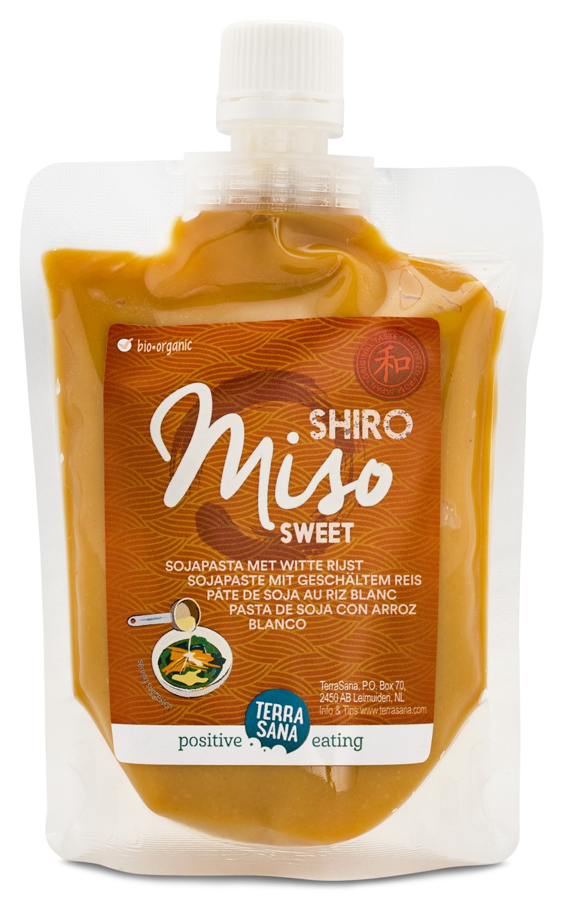 Terrasana Miso Shiro är en söt ekologisk miso med ris, till buljong och misosoppa. Miso är en vegansk sojapasta, med fermenterade sojabönor och ris. Terrasana Miso Shiro är en ljus och söt variant, utan tillsatt socker.