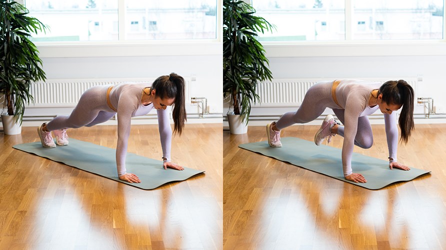 Mountain climbers- Bra övning för att få upp flås och samtidigt träna magmusklerna. Ställ dig i plankposition med raka armar. Se till att händerna är rakt under dina axlar. Lyft sedan växelvis höger och vänster knä fram mot bröstet i ett högt tempo, som att du “springer” på stället. Kom ihåg att hålla rumpan och ryggen rakt för att inte felbelasta.