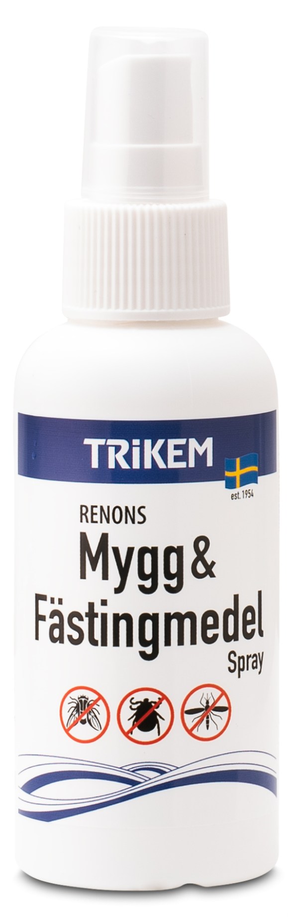 Trikem Renons Mygg & Fästing är en spray som ger ett effektivt skydd mot fästingar, flugor, myggor och andra bitande insekter. Sprayen innehåller 20 % icaridin som ger ett långvarigt skydd i upp till 24 timmar. Innehåller dessutom propylenglykol som motverkar uttorkning. Vätskan är ofärgad och därför skonsam mot utrustning. Låg miljöpåverkan och toxicitet! Kan användas på både häst och människa.