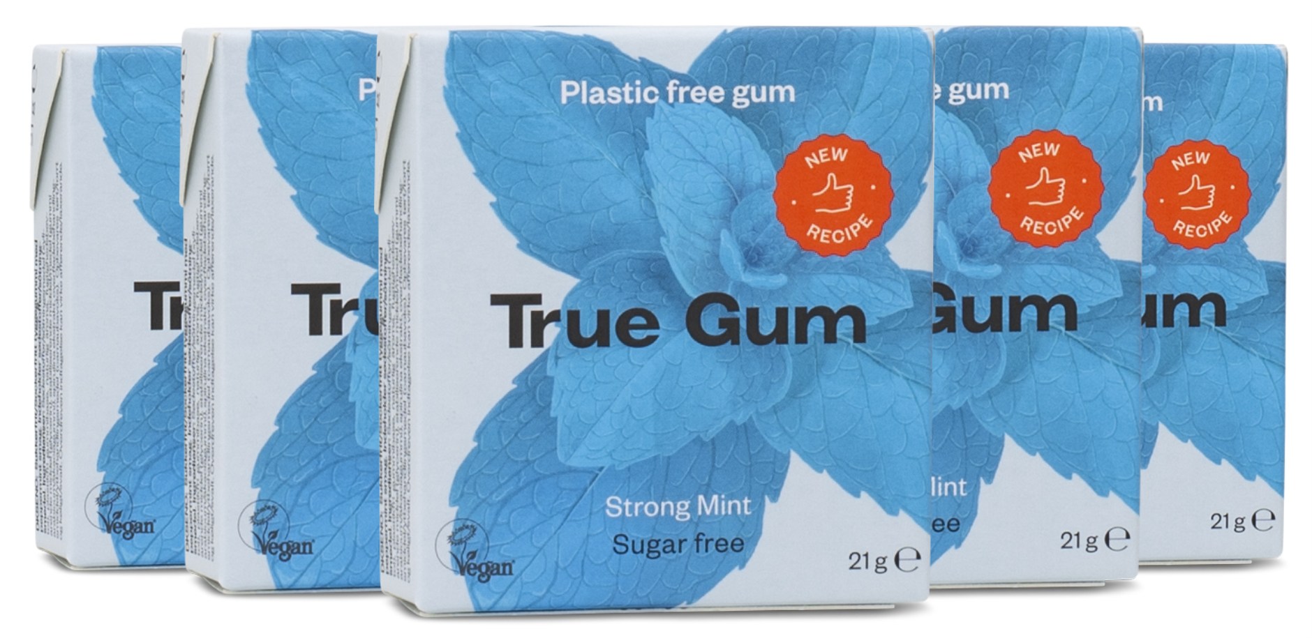 True Gum är ett danskt företag som tillverkar naturliga tuggummin och pastiller utan tillsatt socker, konstgjorda ämnen eller konserveringsämnen. Visste du att tuggummin innehåller plast? Tuggummit från True Gum är helt fritt från plast och är biologisk nedbrytbart. Alla produkter är 100 % biologiskt nedbrytbara och veganska. För att få till smaken använder de stevia och erythritol som sötningsmedel vilket kommer ifrån växtriket.
