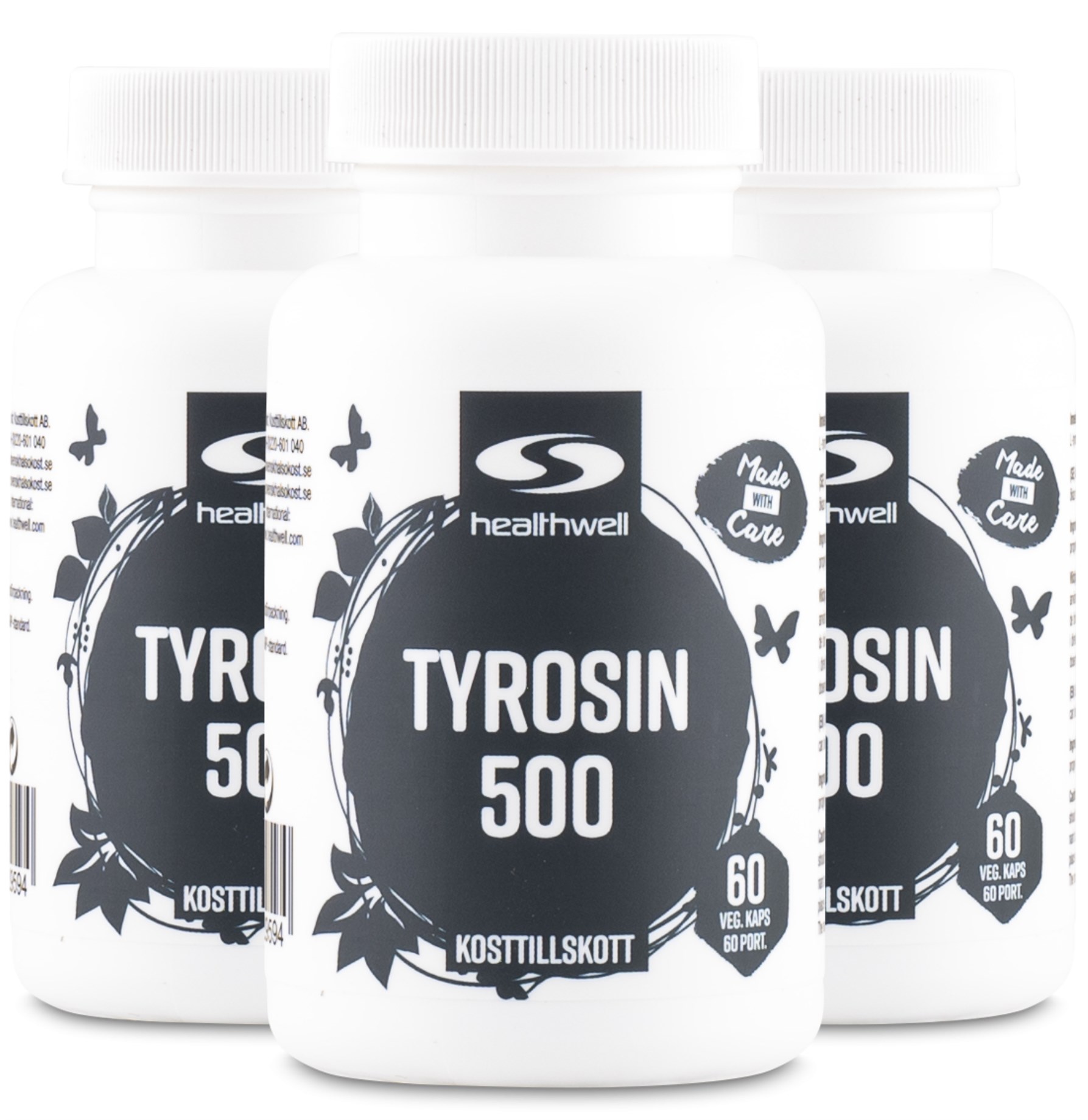 Healthwell Tyrosin 500 är ett vegetabiliskt kosttillskott med det intressanta ämnet tyrosin. Tyrosin är en aminosyra, som likt alla andra aminosyror hjälper till att bygga upp proteiner i kroppen. Tyrosin är bland annat en ingrediens vid kroppens tillverkning av sköldkörtelhormoner samt dopamin och noradrenalin. Tyrosin finns naturligt i vissa proteinrika livsmedel, men ett tillskott kan vara på plats för den som önskar få i sig extra mycket av aminosyran. I Healthwell Tyrosin får du 500 mg tyrosin per kapsel, med en dosering på 1-3 kapslar dagligen.