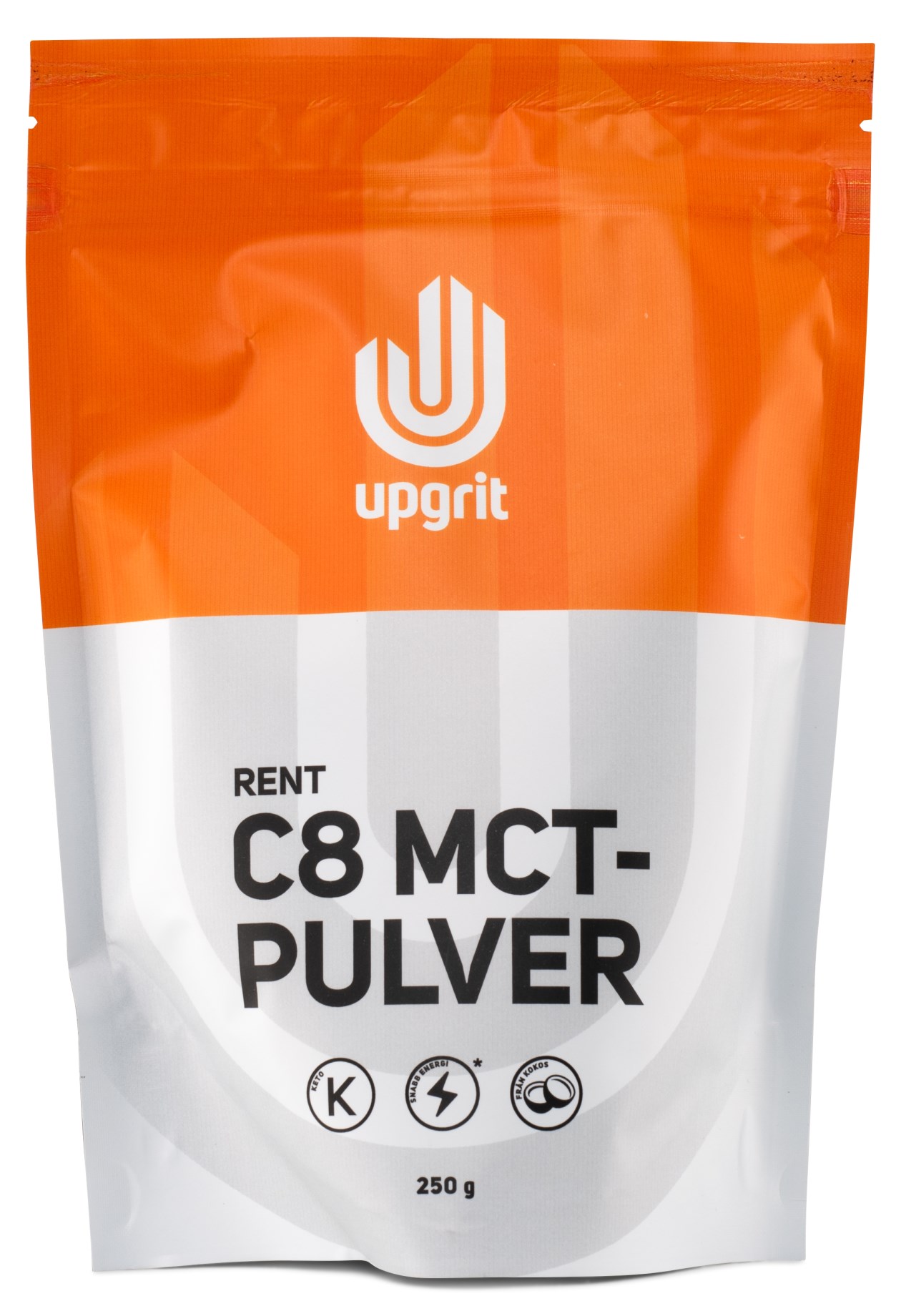 Upgrit C8 MCT-Pulver innehåller fettsyran C8 i pulverform. En populär fettsyra som ger hjärnan snabb energi. MCT, som även kallas kaprylsyra, tas snabbt upp av kroppen jämfört med andra fetter och omvandlas till energigivande ketoner. En fördel med att fettet är i pulverform är att det kan bli lättare för matsmältningssystemet att hantera jämfört med ren MCT-olja i flytande form. Upgrit C8 MCT-Pulver innehåller även prebiotisk akaciafiber. Pulvret är utan smak och doft och passar lika bra att använda i matlagning, i kaffe, te eller i smoothies!