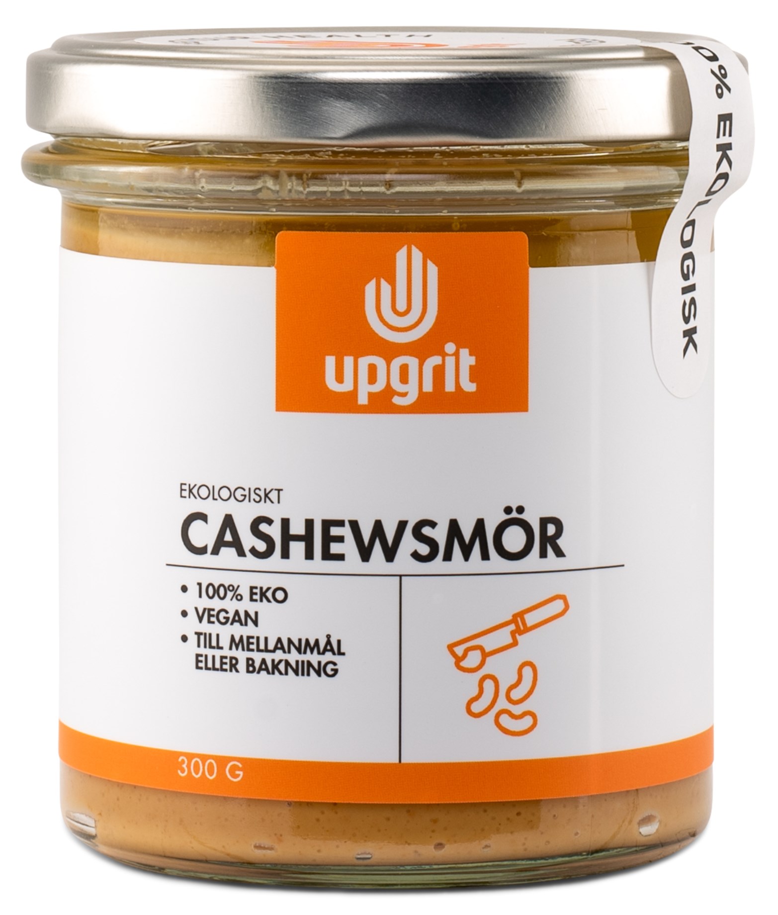 Upgrit Cashewsmör EKO är ett mjukt och härligt cashewsmör gjort på 100% ekologiska cashewnötter. Smöret innehåller inga tillsatser och är inte i kombination med andra nötter, utan är ett rent cashewsmör. Passar utmärkt på kex, bröd, till mellanmål och till bakning, endast fantasin sätter stopp! Nötterna i smöret är rostade och är därför inte raw.