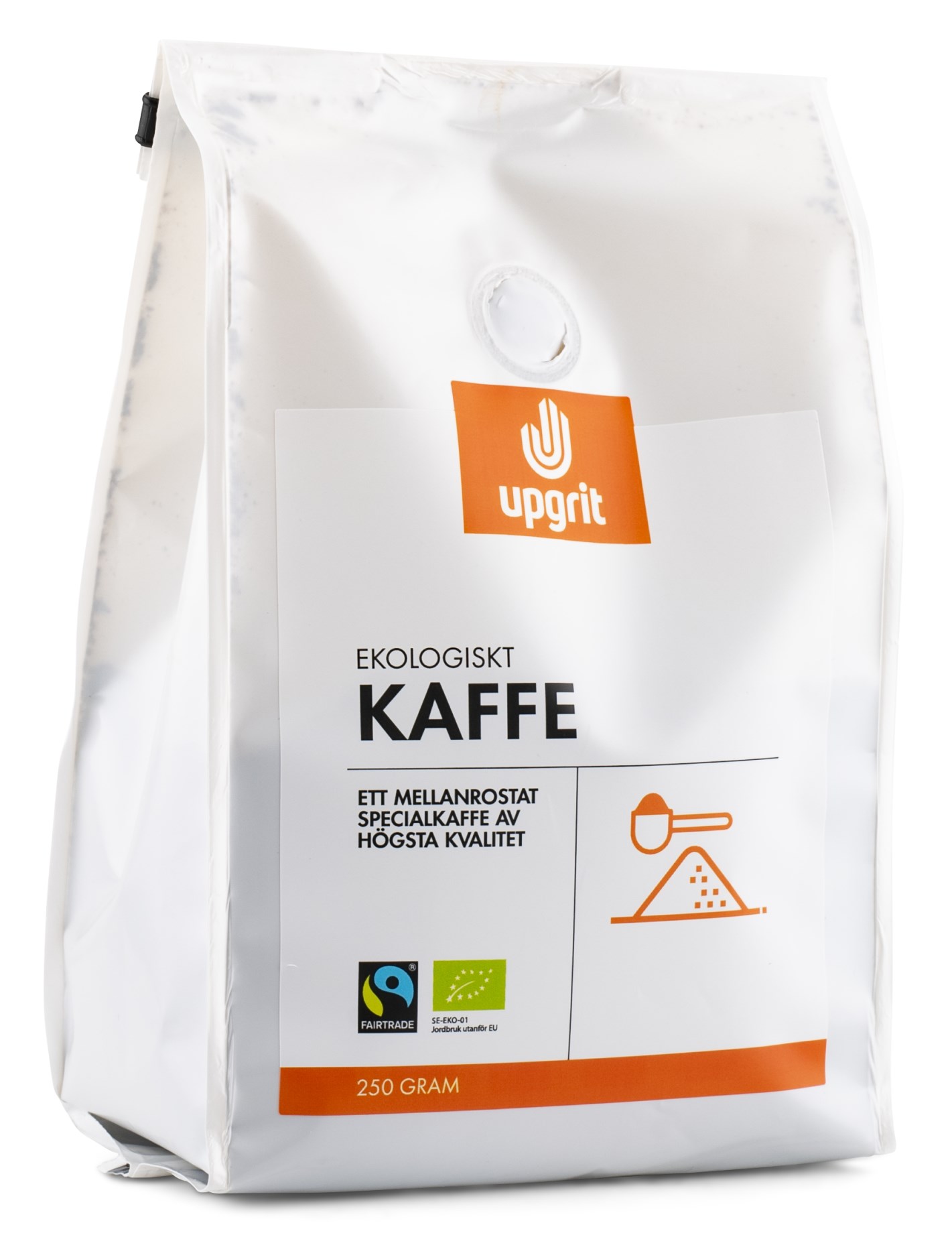 Upgrit Ekologiskt Kaffe är ett ekologiskt mellanrostat kaffe som går åt det mörkare hållet med toner av karamell, äpple och mandlar. Kaffet från Upgrit är noga utvalt för att hålla högsta kvalitet, vilket innebär att det är spårbart och odlat under schyssta förhållanden av människor som bryr sig om sin råvara. Kaffet från Upgrit är producerat med den så kallade tvättade processmetoden, vilket bidrar till att minimera bildandet av mykotoxiner. Bönorna är Arabicabönor som antingen kommer från Cusco i Peru eller Ocotopeque i Honduras, beroende på säsong. Njut av en kopp ekologiskt kaffe!