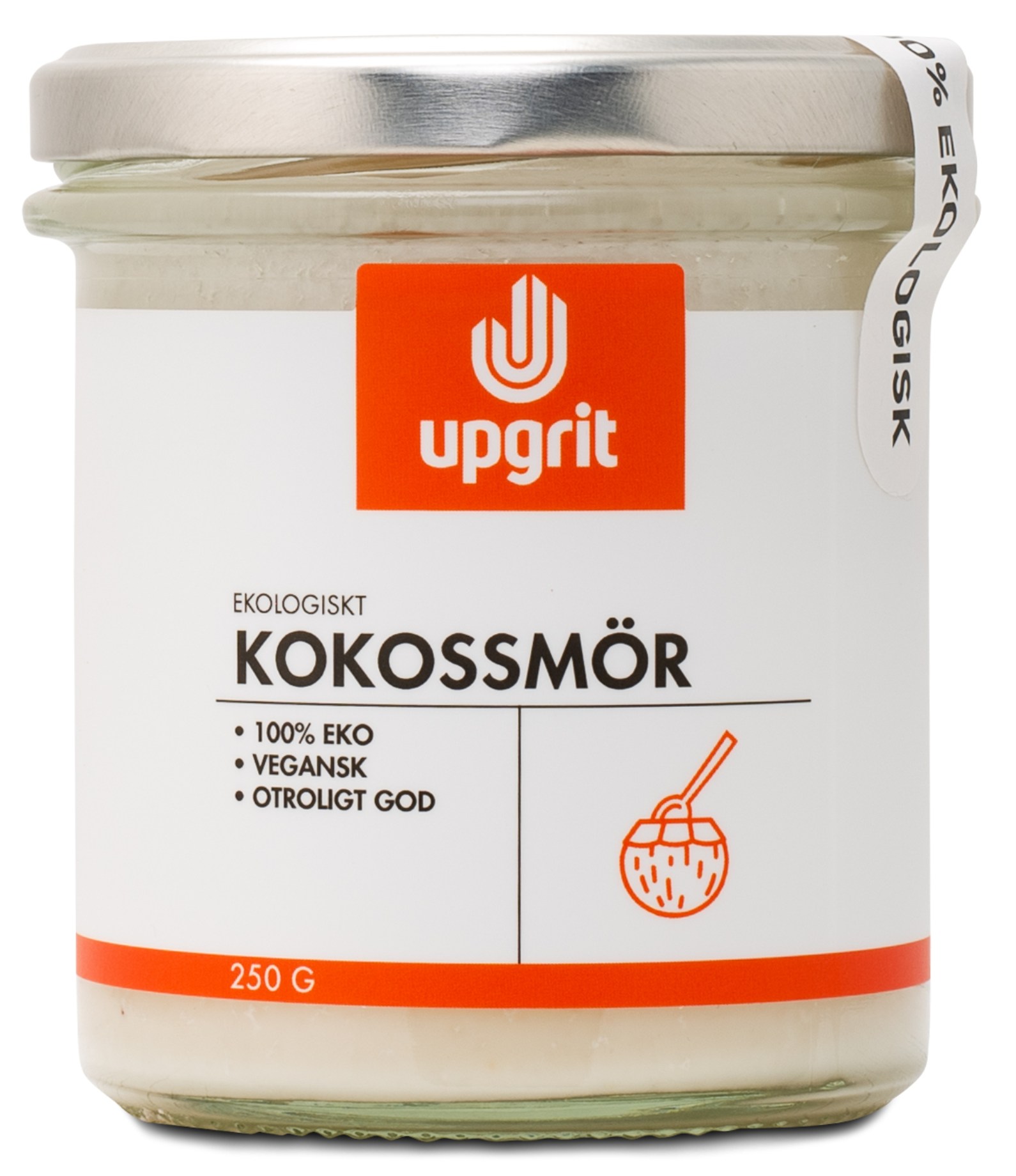 Upgrit Kokossmör EKO är ett kokossmör som har många användningsområden. Det går lika bra att bryta en bit och äta som det är som att använda i matlagning när du gör grytor, eller till bakning. Prova även att göra din egen spread! Kokossmör har en sötare smak än kokosolja, men smöret från Upgrit innehåller inget tillsatt socker utan består endast av 100% kokos. Då produkten är helt naturlig kan fetterna i burken skikta sig, men detta är en naturlig process och om detta uppstår går det bra att värma burken i varmt vatten och därefter ställa den i kylskåpet.