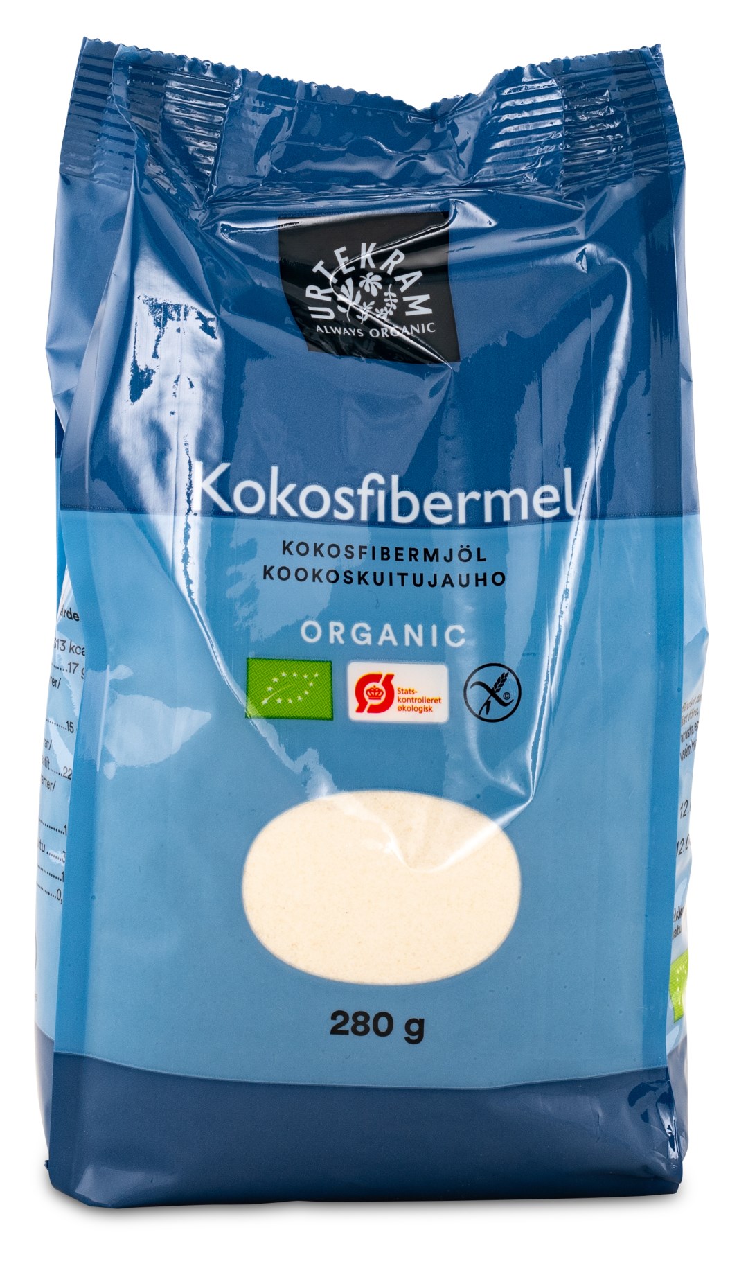 Kokosfibermjöl kallas även bara kokosmjöl, och är malet kokoskött, helt utan andra tillsatser. En kokosnöt ger både krämig mjölk, kokosolja och kokosmjöl, och tack vare denna separation får mjölet en lägre fett- och kolhydratmängd. Urtekrams kokosfibermjöl kommer från ekologiska nötter från Filippinerna, och har en god kokossmak med mild sötma. Passar bra som ersättning till vetemjöl eller andra nötmjöl i såser, bakning och smoothies. Prova du också, bara fantasin sätter gränserna!