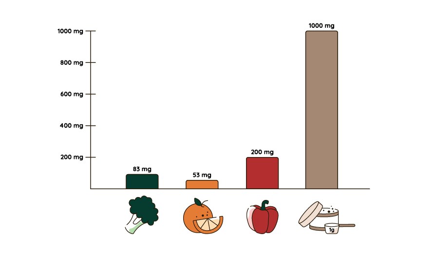 Vitamin C är ett annat vanligt tillskott som finns i många svenska hushåll och ofta tas till i förkylningstider. Vitamin C i tillskott förekommer vanligtvis i form av askorbinsyra. Precis som många andra tillskott används bakterier för syntesen. Här använder man ofta majssocker, majsstärkelse eller risstärkelse för att utvinna sorbitol, en sockeralkohol som bakterier sedan oxiderar till sorbos. Sorbos omvandlas sedan till askorbinsyra i en serie av steg.