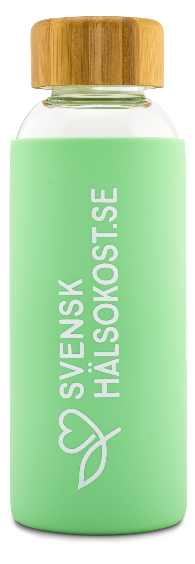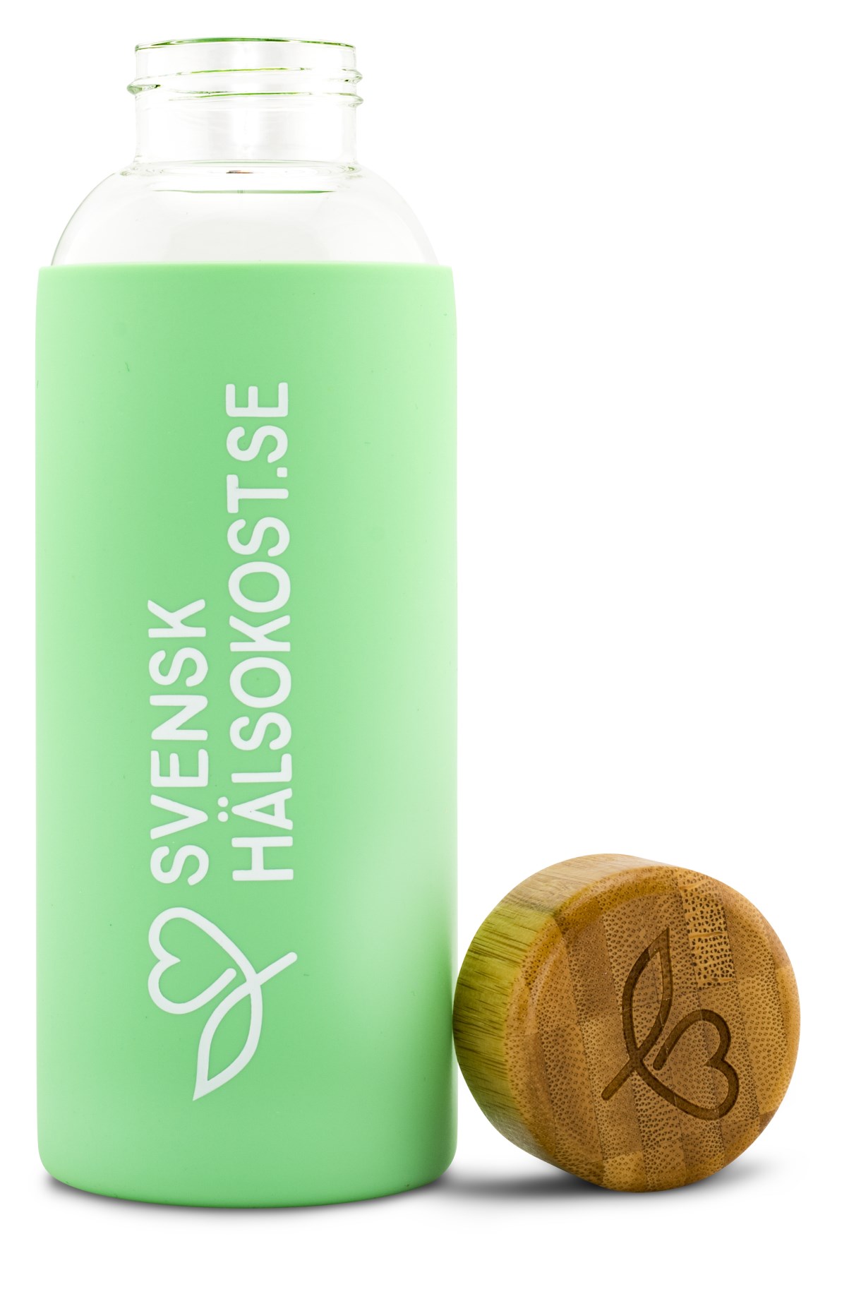 Svensk Hälsokost Vattenflaska är tillverkad av återvunnet glas för att värna om vår miljö - både på kort och lång sikt. Förutom att glaset har återvunnits kan du även använda en glasflaska betydligt längre än en plastflaska eftersom den inte får repor där bakterier samlas, den rostar inte och vattnet behåller sin fräscha, goda smak även efter flera timmar. Dessutom slipper du garanterat undan BPA (Bisfenol A), ett ämne som används i vissa plastprodukter. BPA har visat sig kunna vara hormonstörande vid stora mängder. Många plastprodukter tillverkas idag av BPA-fri plast men för dig som verkligen vill vara på den säkra sidan är en glasflaska ett bra alternativ. Svensk Hälsokost har en kork i bambu, vilket anses vara ett miljövänligt alternativ till plast av flera orsaker. Det kan odlas helt utan gifter och tillsatser och är även snabbväxande. Dessutom omvandlar bambu koldioxid till syre på ett särskilt effektivt sätt.
