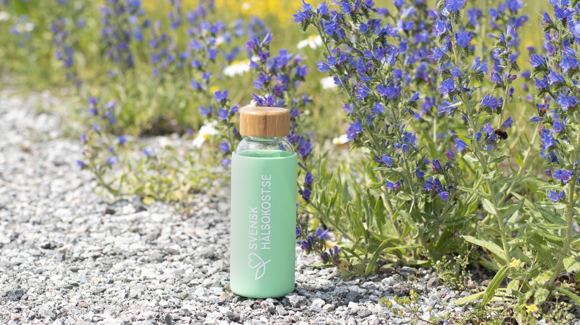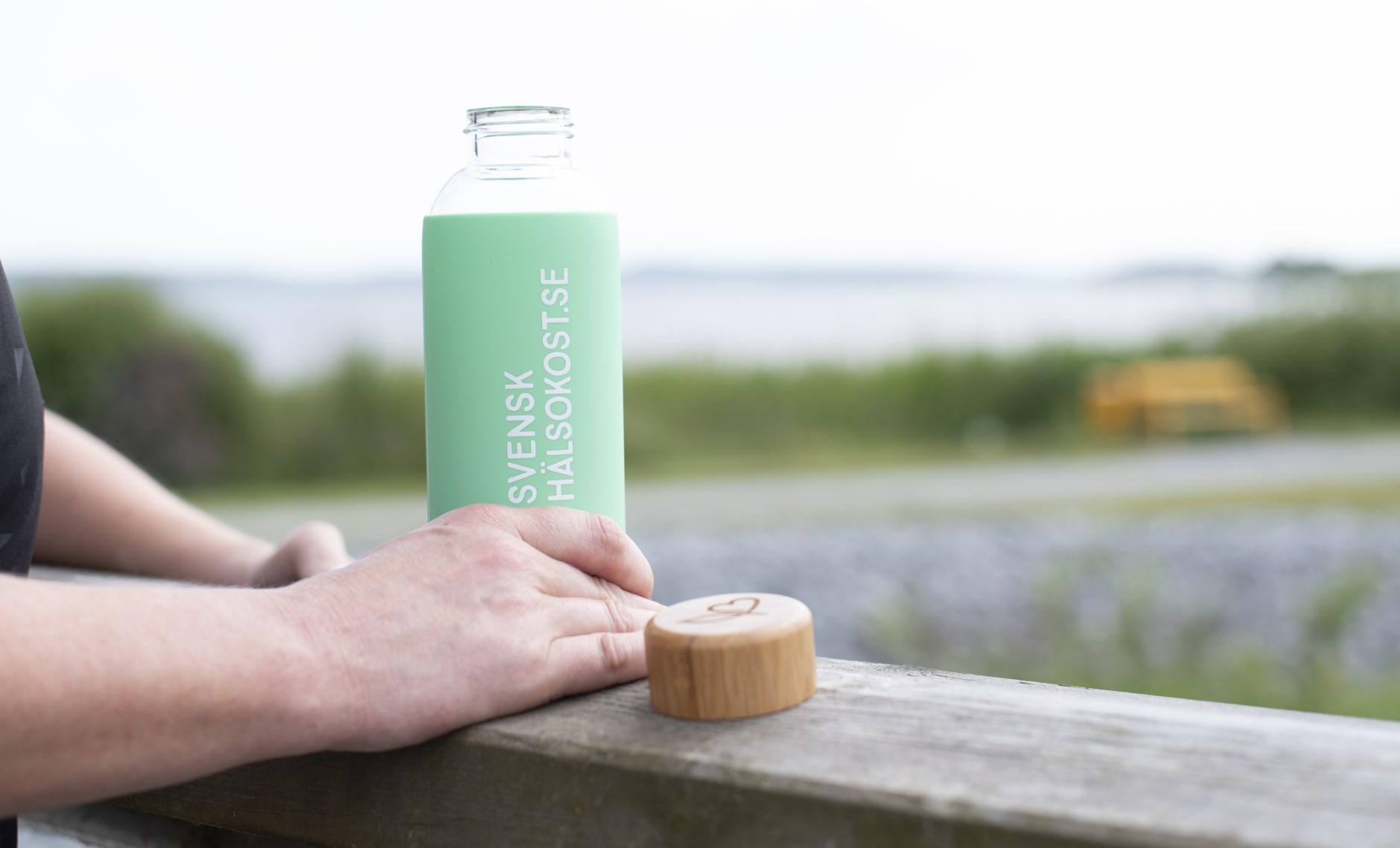 För dig som vill ta med dig vatten när du är på språng finns Svensk Hälsokost Vattenflaska! Denna flaska i glas rymmer 400 milliliter och passar perfekt även i en mindre väska så att du alltid kan hålla koll på vätskebalansen. Svensk Hälsokost Vattenflaska är tillverkad av återvunnet glas och är dessutom riktigt fin med en kork i bambu med lasergravering samt ett skyddshölje i silikon som skyddar mot stötar och ger ett bra grepp. Detta är helt enkelt en flaska för dig som alltid vill ha tillgång till fräscht vatten oavsett om det är under yogaklassen, på kontoret eller på picknicken med familjen.