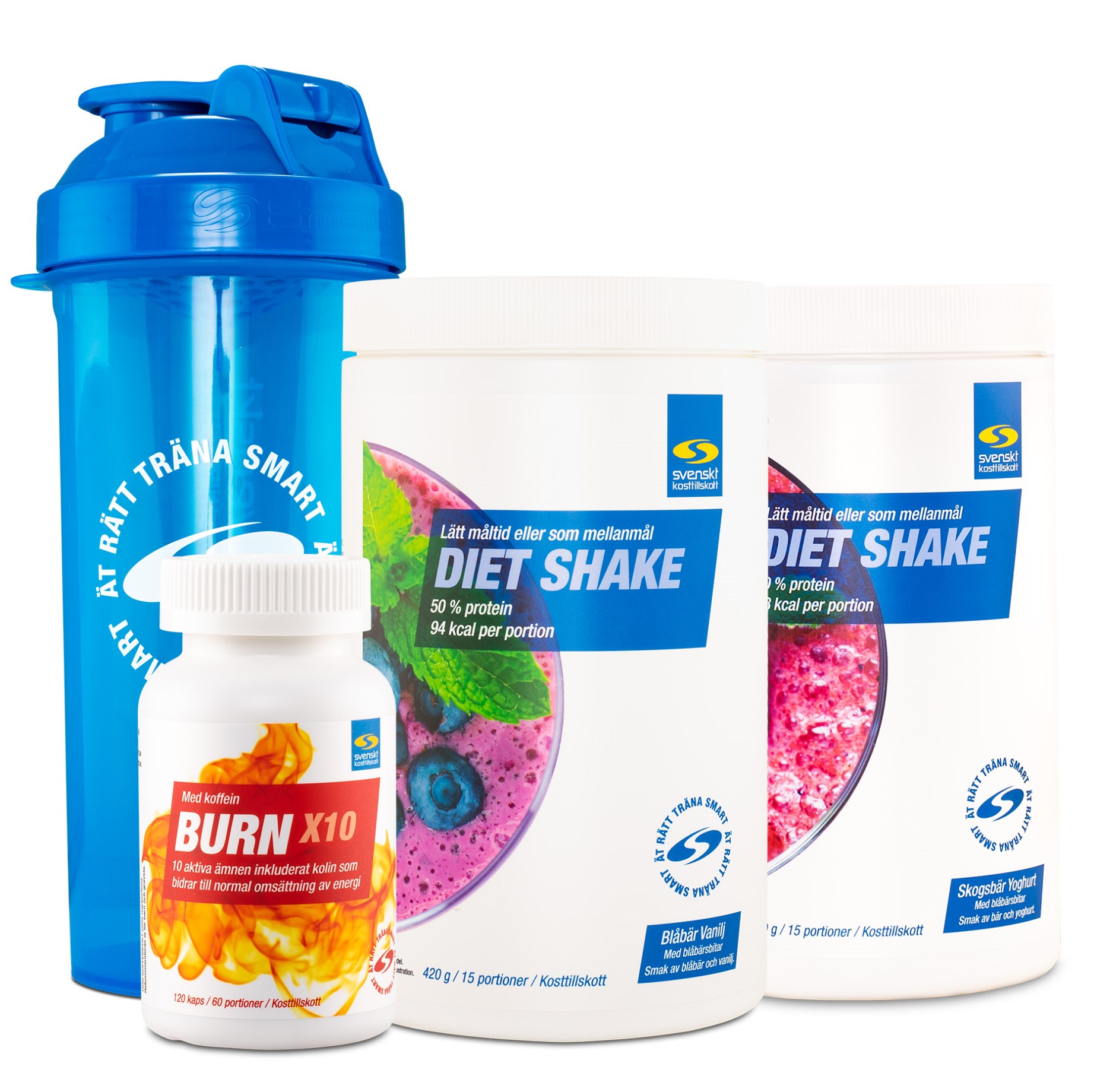 Därför innehåller paketet två riktiga favoriter för viktnedgång som båda hjälper dig att göra en hälsosammare viktresa. Med dessa produkter minskar du smidigt ner dagens kaloriintag genom att byta ut en måltid mot Diet Shake, samtidigt som du maximerar din fettförbränning med hjälp av de aktiva ämnena i BURN. Innehåll som capsaicin, grönt te och krom ger dig rätt förutsättningar att se resultat av dina ansträngningar!