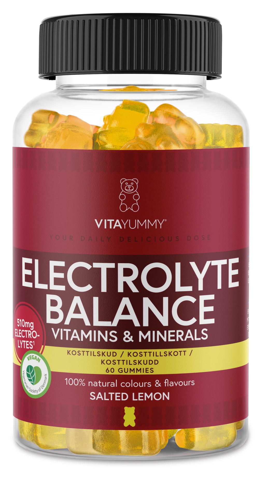 VitaYummy Electrolyte Balance innehåller magnesium, klorid, kalium och natrium som hjälper till att upprätthålla vätskebalansen. När du svettas, tränar eller lever ett aktivt liv förlorar kroppen både vätska och salter, och då blir elektrolyterna extra viktiga för att kroppen ska fungera optimalt. Magnesium, som ingår i gummien, bidrar till elektrolytbalans, normal psykologisk funktion och nervsystemets normala funktion. Dessutom ingår vitamin C, som hjälper till att minska trötthet och utmattning. Den vackra, naturliga färgen i VitaYummy Electrolyte Balance kommer från morot och pumpa, och har en härlig smak av salted lemon. Produkten är vegansk och fri från artificiella färgämnen, smakämnen och sötningsmedel.