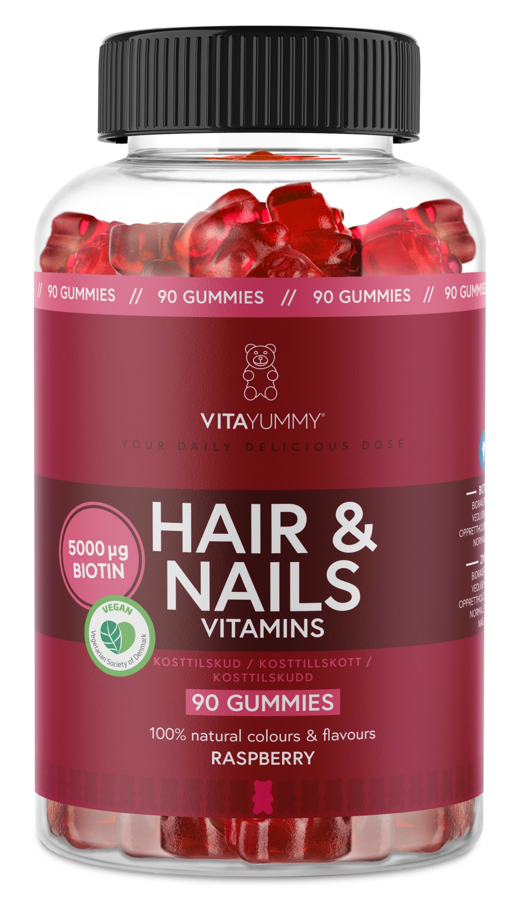 VitaYummy Hair & Nails är gummies i goda smaker som innehåller vitaminer och mineraler. Varje gummie innehåller vitamin A, B, C, D, E och mineralerna zink, selen och jod. Biotin, alltså vitamin B6, och zink bidrar till normalt hår och naglar och selen bidrar till att skydda cellerna mot oxidativ stress. VitaYummy Hair & Nails innehåller inga konstgjorda färg- och smakämnen och är helt vegansk.