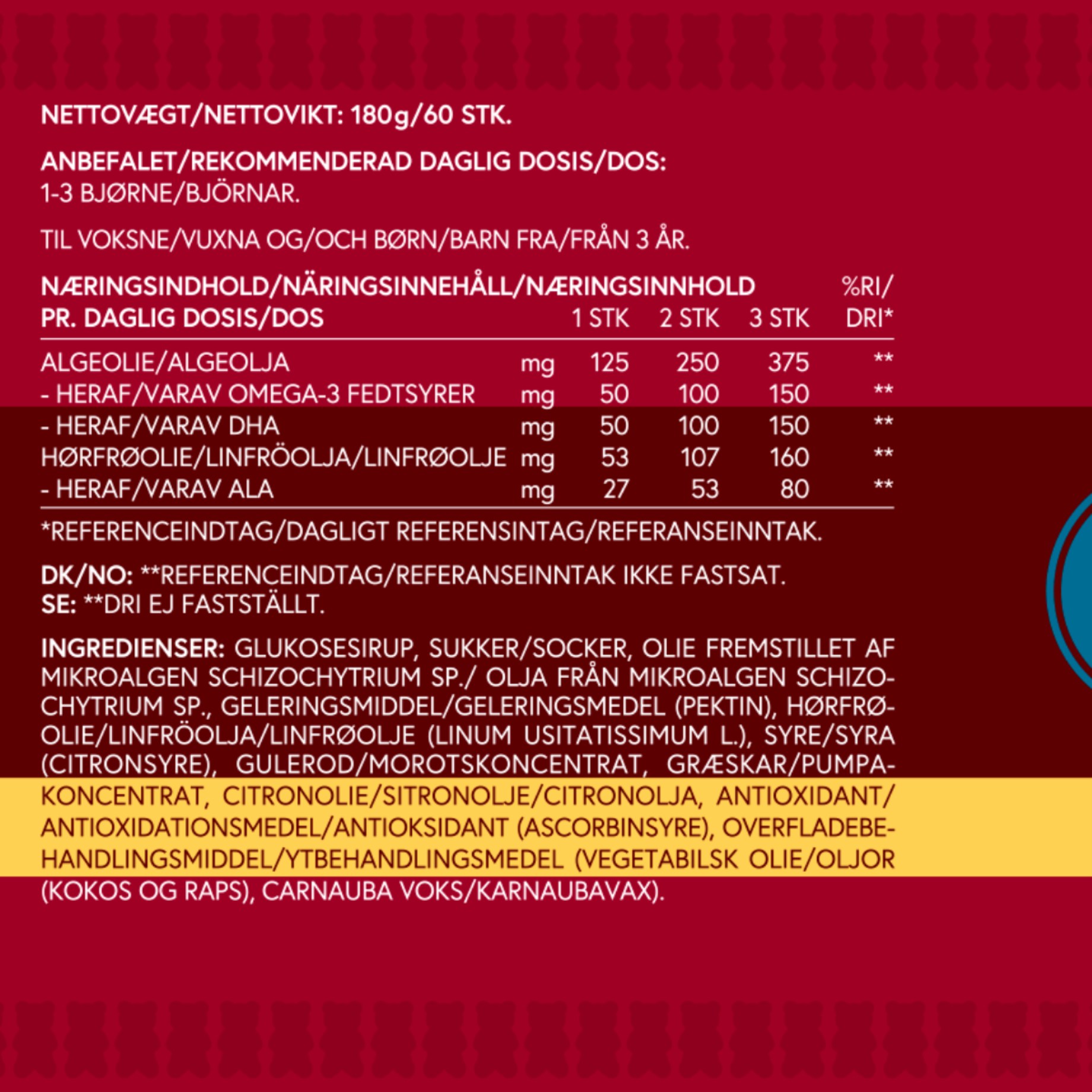VitaYummy Omega 3 är ett omega-3-tillskott som passar både barn och vuxna. Innehåller både DHA och ALA och är helt vegansk, då de aktiva fettsyrorna kommer från alger och linfrön. DHA bidrar till hjärnans normala funktion och till normal syn. ALA är en naturligt förekommande fettsyra i kroppen. VitaYummy Omega 3 är perfekt som ett växtbaserat alternativ till traditionell fiskolja – fritt från artificiella färger och smaker. Den naturliga färgen kommer från morot och pumpa.