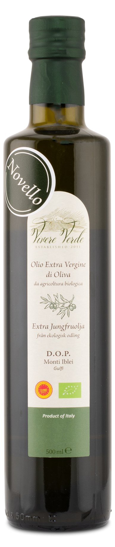 Vivere Verde Extra Jungfruolja Novello är utvunnen från en gård på södra Sicilien och är 100 % ren, med innehåll från en olivsort som utsetts till världens finaste sort för olivolja. Oljan har en hög kvalitet och är ekologiskt certifierad samt ursprungs- och kvalitetscertifierad D.O.P. Monte Iblei av det italienska jordbruksdepartementet. Detta garanterar innehållet av 100 % ren olivolja. Dessutom innebär det att att pressningen skett utan värme och kemikalier. Odlingen har skett genom ekologiska principer och är certifierad BIO. Oliverna är handplockade och omsorgsfullt granskade, och kommer från en och samma gård – vilket innebär att ingen utomstående har haft tillgång till vare sig träden, skörden, pressningen eller lagringen i något skede. Olivsorten som har använts, från träd av sorten Tonda Iblea, har utsetts till världens finaste oliver för olja, som ger en mycket aromatisk smak.