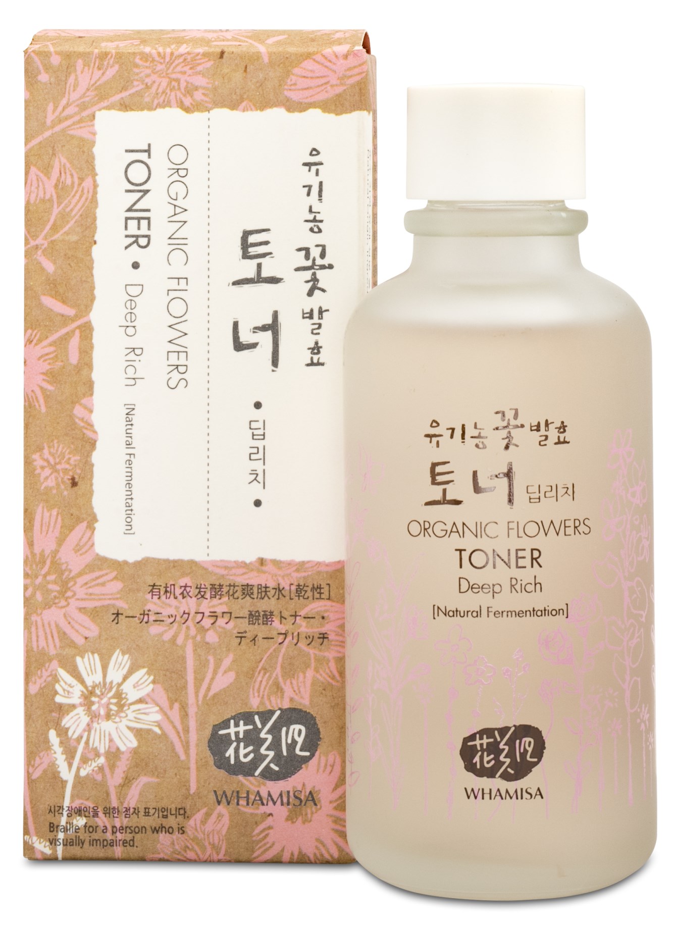 Whamisa Organic Flowers Toner Deep Rich är ett tjockare ansiktsvatten som har en serumliknande konsistens. Ansiktsvattnet är berikat med maskros, lotusextrakt, arganolja och galactomyces. Lotusextrakt har sammandragande egenskaper och botaniskt extrakt från Aloe maculata blad och krysantemum används istället för vatten för att maximera återfuktningen.