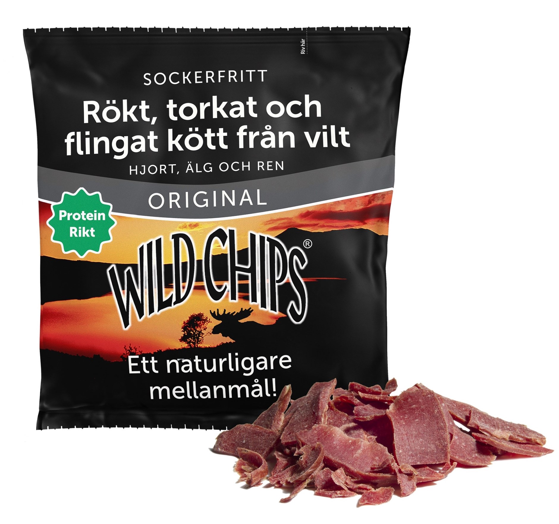 Ett fantastiskt gott, lättrökt och torkat kött från älg, hjort och ren. Wild Chips är en riktig godsak och ger dig ett rent, friskt och enkelt mellanmål eller snacks med bra näringsvärden.