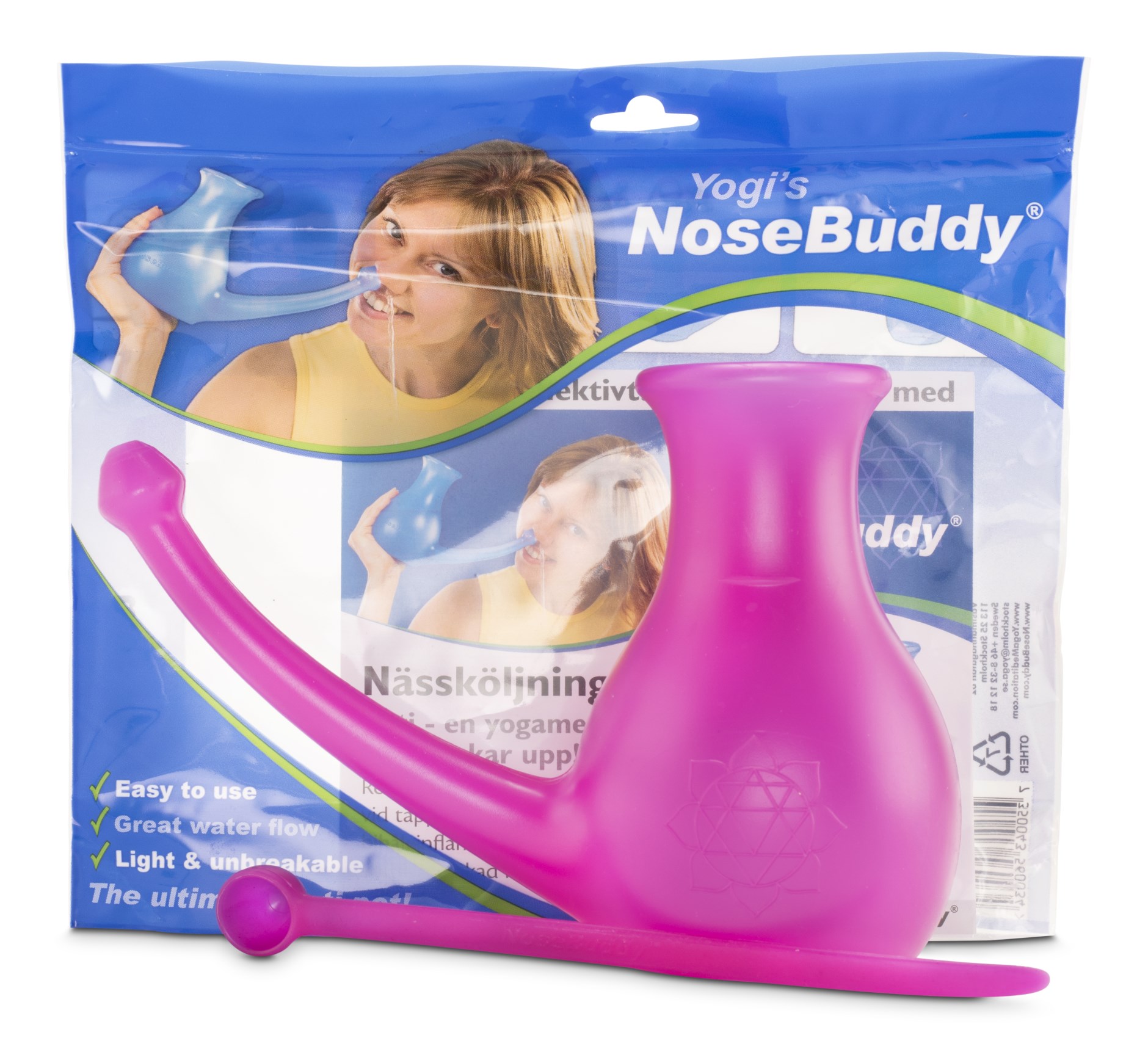 Yogis NoseBuddy hjälper dig att hålla näsan ren och göra det lättare att andas även vid förkylningar. Detta verktyg är speciellt utformat för att nå långt in i näsan även då du är väldigt täppt och varje kanna rymmer hela 0.5 liter vatten så att du får en rejäl sköljning. Yogis NoseBuddy kan användas vid förkylning, allergi, problem med bihålorna eller när du helt enkelt vill få en rejäl rensning för kropp och sinne. En måttsked för salt medföljer för att göra doseringen både enkel och korrekt.